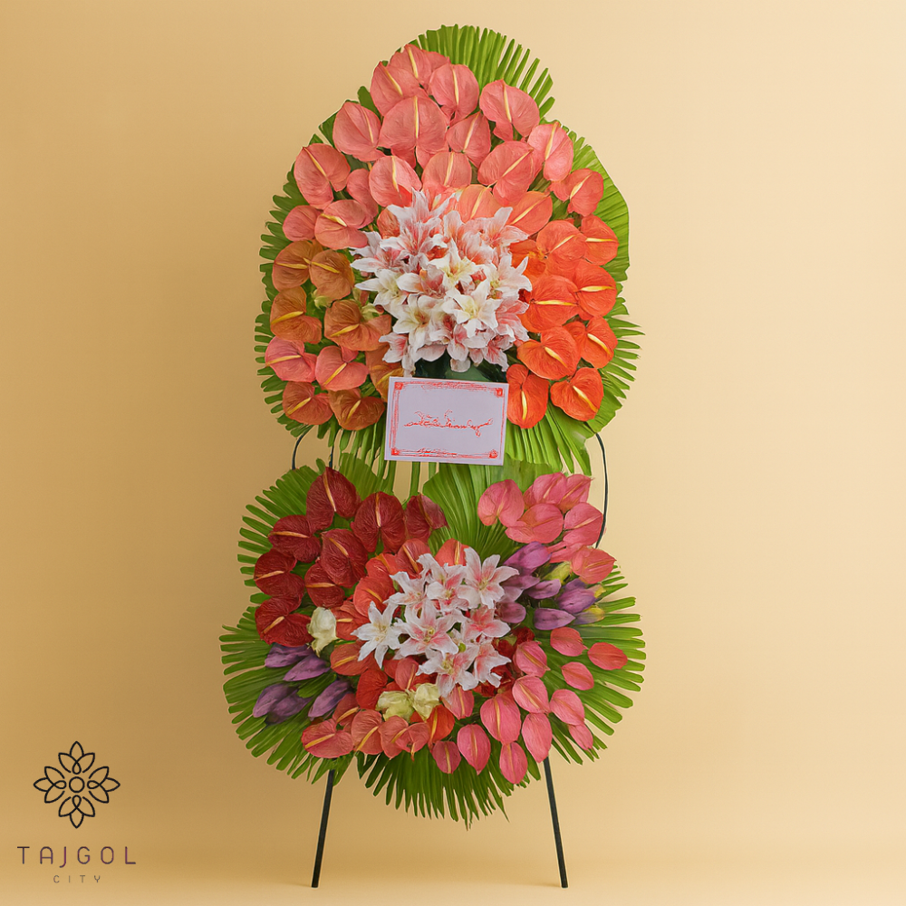 | برگ های سبز | این تاج گل با طراحی لوکس و رنگهای شاد برای مراسمهای رسمی و خاص مناسب است. |