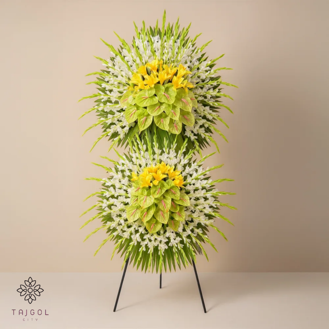 | برگهای سبز: | پراکنده به عنوان تزئینات در تاج گل |