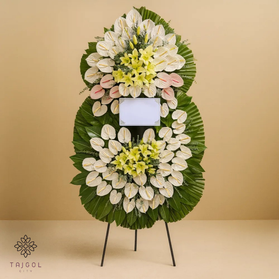 | برگهای سبز و گیاهان تزئینی: | تعداد زیادی برگ و گیاهان سبز برای تزئین فضای تاج گل |